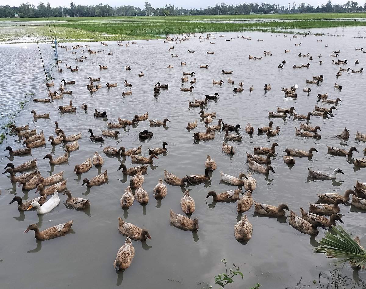 Two children are playing with a bicycle tire on a rural path. The picture was taken from Gangachara of Rangpur on 25 August.A flock of ducks is splashing in a pond. The picture was taken from Dabirganj of Ullapara on 25 August.
