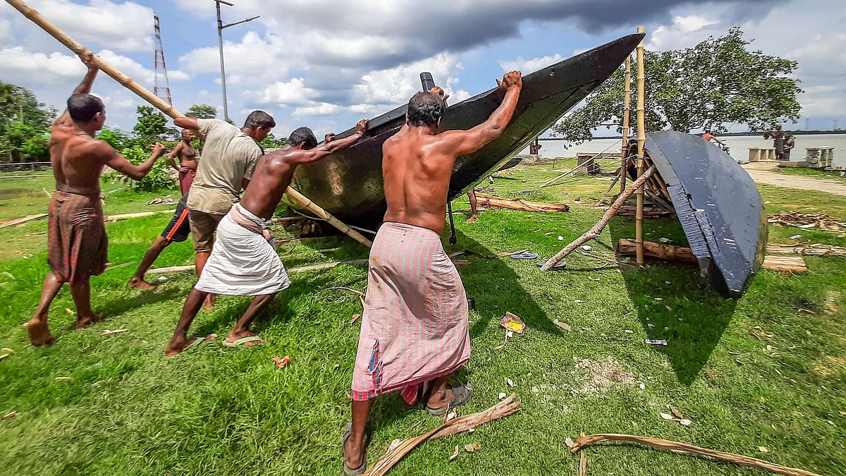 Fishermen repair a boat to fish in the river. The picture was taken from Batiyaghata in Khulna on 31 July.