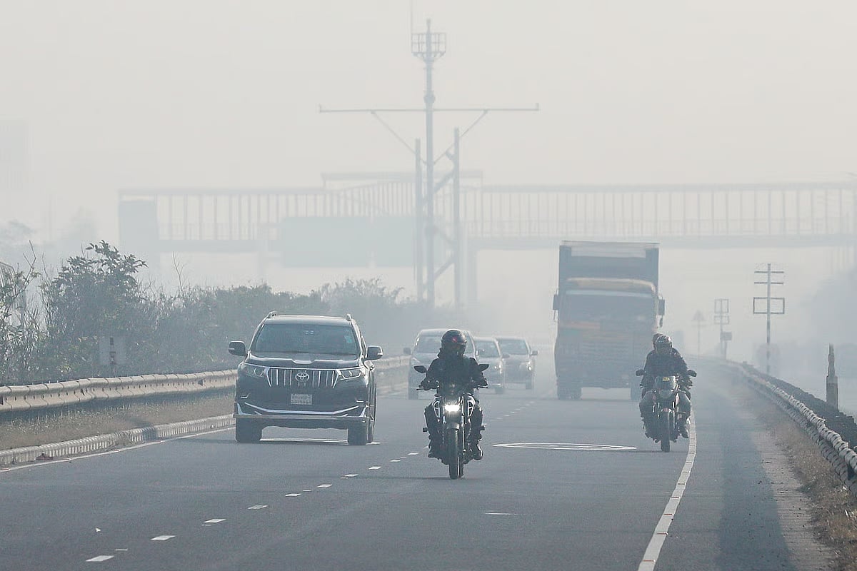 Several vehicles, including motorbikes, speed through the dense fog in Nimtala-Rajendrapur area of the Dhaka-Mawa Expressway.A pedestrian walks across the busy, fog-covered highway in the morning.