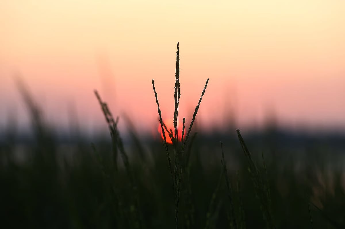 The sky and the earth merge into one golden hue as a boat glides through the serene water.The sun sets, casting its final light over the paddy sheaves.