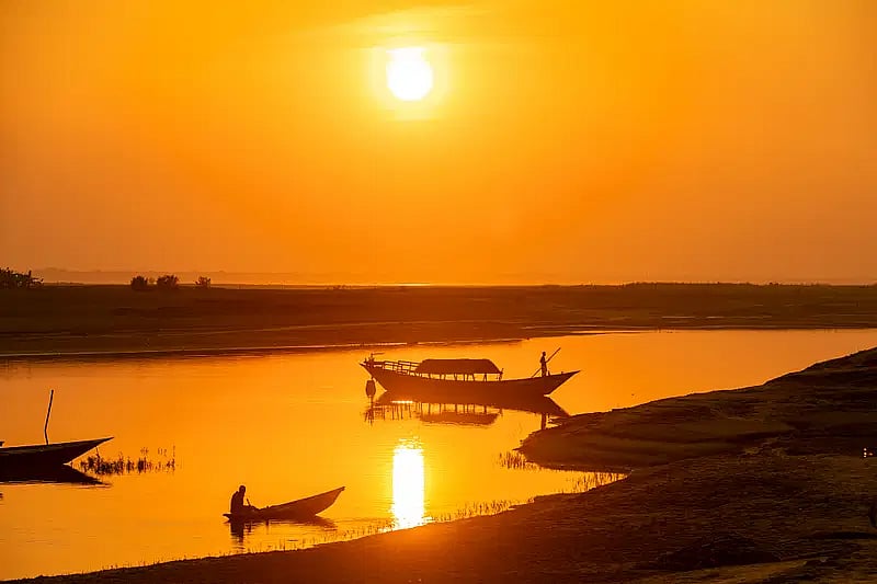 Silhouettes of boats can be seen in the water as the river seems to be merged with the sky under the orange glow of the setting sun. Photo snapped from Padma Ghat area in Pabna on 27 December 2024.