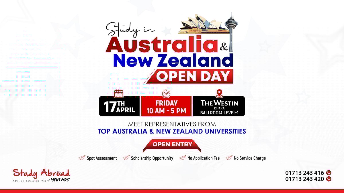 The event will take place on Friday, 17 April, 2026, from 10:00am to 5:00pm at The Westin Dhaka in the capital. University representatives from several reputed universities in Australia and New Zealand will be present at the Open Day. Interested students will have the opportunity to directly engage with them and learn in detail about bachelor’s, master’s, foundation, diploma, and other academic programmes.