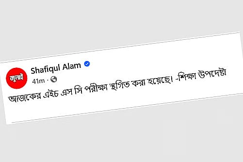 Shafiqul Alam posted the news early this morning on his verified Facebook account at around 7:15 am, writing, “Today’s HSC exam has been postponed: Education Adviser.”