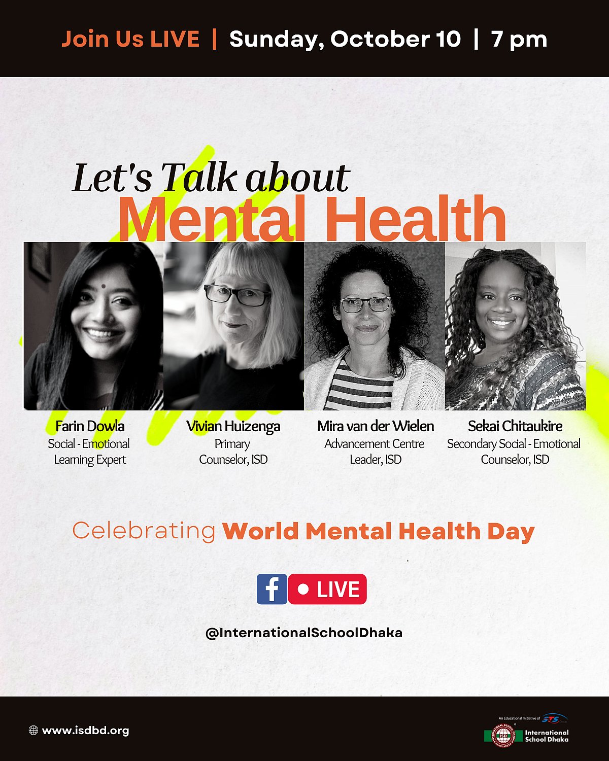 The session will be facilitated by Farin Daulah, an expert on social-emotional learning in Bangladesh, and go live on ISD's Facebook page (@InternationalSchoolDhaka) on 10 October 2021, from 7:00 PM to 7:45 PM (BST).