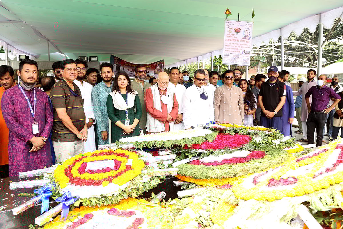 A procession of IUB students, officials, and employees, led by vice chancellor Tanweer Hasan placed a floral wreath at the pedestal of the mural of the Father of the Nation Bangabandhu Sheikh Mujibur Rahman located in front of the Bangabandhu Memorial Museum at road no. 32 in the capital's Dhanmondi area.