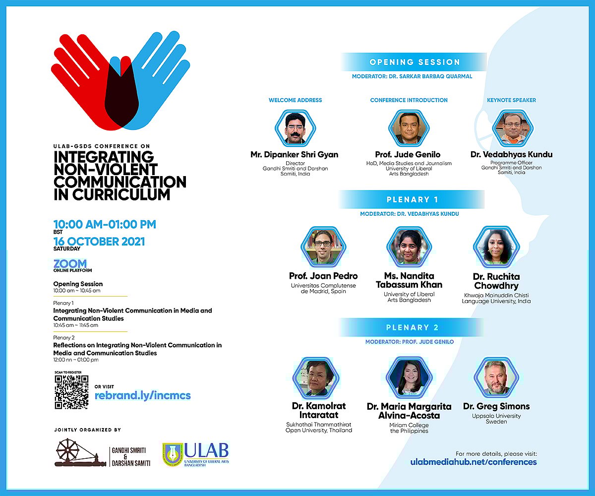 The University of Liberal Arts Bangladesh (ULAB)'s Media Studies and Journalism Department organised an online conference on "Integrating Non-Violent Communication in Curriculum" in collaboration with Gandhi Smriti and Darshan Samiti (GSDS), India. The conference was held on the Zoom platform on 16 October 2021.