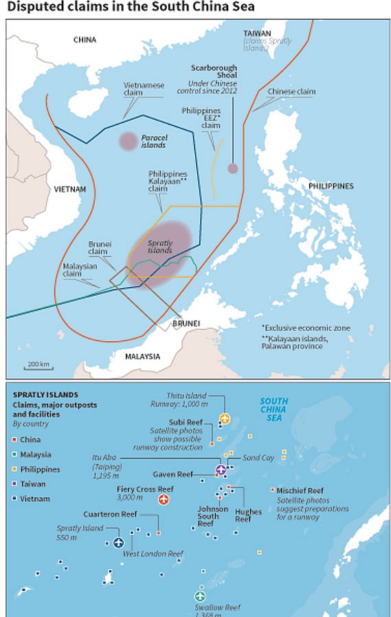 In essence, China claims most of the sea, even waters approaching neighbouring countries, based on a vaguely defined “nine-dash” Chinese map dating back to the 1940s. The Philippines disputes this.